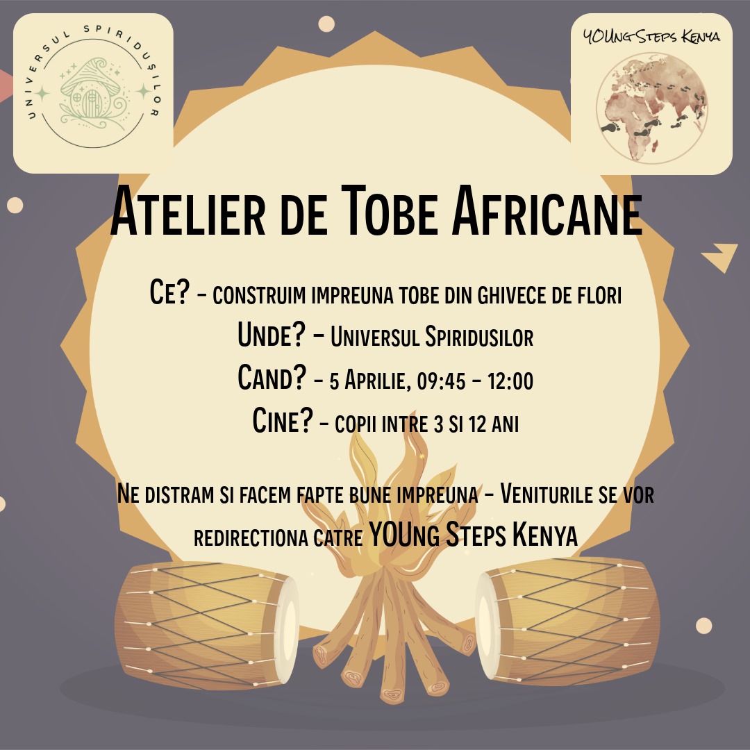 Te așteptam la un atelier ‚altfel‘. Copiii vor descoperi o frantura din cultura africana, decorand tobe africane, pe care le vom confecționa din ghivece de flori. În paralel vor putea vedea poze și auzi povesti despre cum cresc și trăiesc copiii în alte colțuri ale lumii, si anume in Kenya.